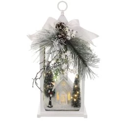 This festive lantern features battery-operated LED lights surrounded by a house and snowy tree figurines. Accented with pine branches, white holly berries and frosted pine cones, this tabletop décor will be a great addition to your Christmas décor.