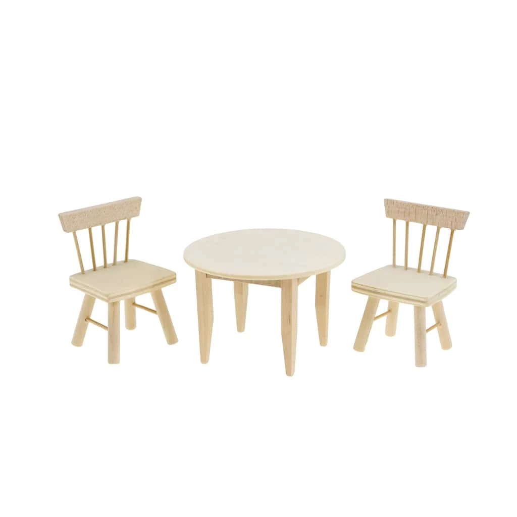 This adorable miniature wooden table and chair set will make a wonderful addition to your dollhouse kitchen dΓ©cor. Pair it with a miniature oven, countertops, food and other kitchen or dining room accents to complete the display.